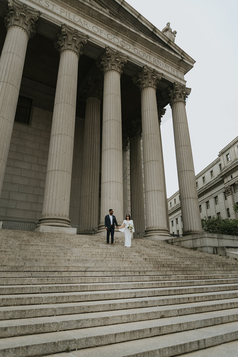 As a wedding photographer, capturing the essence of a Manhattan City Hall elopement in the bustling month of May is a unique and exhilarating experience. The city comes alive with the promise of new beginnings, and every moment is infused with a sense of adventure and spontaneity. Molly exuded elegance in a silk white form-fitting dress, adorned with a chic white suit jacket gracefully draped over her shoulders. Her bouquet, a stunning arrangement of white florals with delicate greenery, added a touch of natural beauty to the urban landscape.